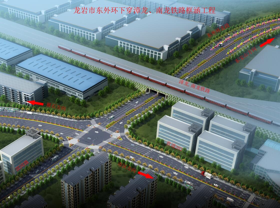 东外环下穿漳龙、南龙铁路框涵AYX爱体育顶进框架总宽41.75米,长43米,框架孔跨布置为:6m(非机动车道)+12m(机动车道)+12m(机动车道)+6m(非机动车道);机动车道框架采用C40钢筋混凝土,净空≥4.5m,非机动车道框架C40钢筋混凝土,净空≥2.5m,项目出资约8000万元。
