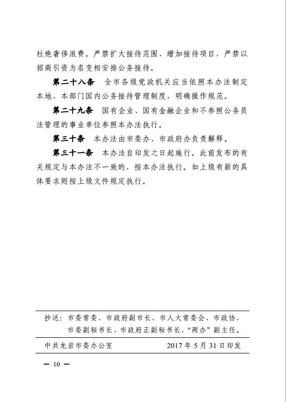 市委办、市政府办关于印发《龙岩市党政机关国内公务接待管理暂行办法》的通知(岩委办发【2017】20号)