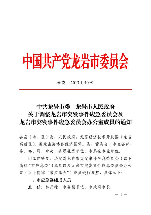 市委关于调整龙岩市突发事件应急委员会及龙岩市突发事件应急委员会办公室成员的通知(岩委【2017】40号)